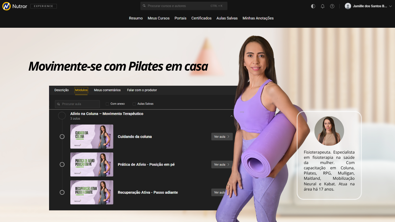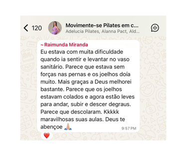 Foi por isso que criei o MOVIMENTE-SE COM O PILATES EM CASA para mostrar que é possível recuperar o bem-estar mesmo com a rotina corrida — com orientação profissional, um programa simples, acessível e eficaz, pensado para se encaixar na sua rotina e respeitar o seu corpo. Acredito que alívio e força vêm do cuidado com o corpo. E esse cuidado começa com o primeiro passo.